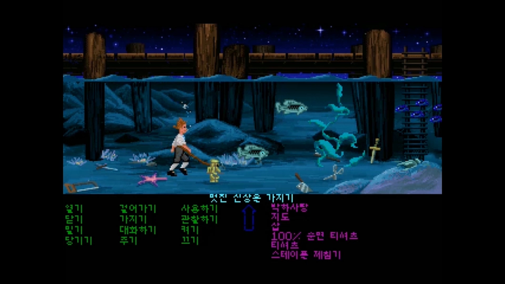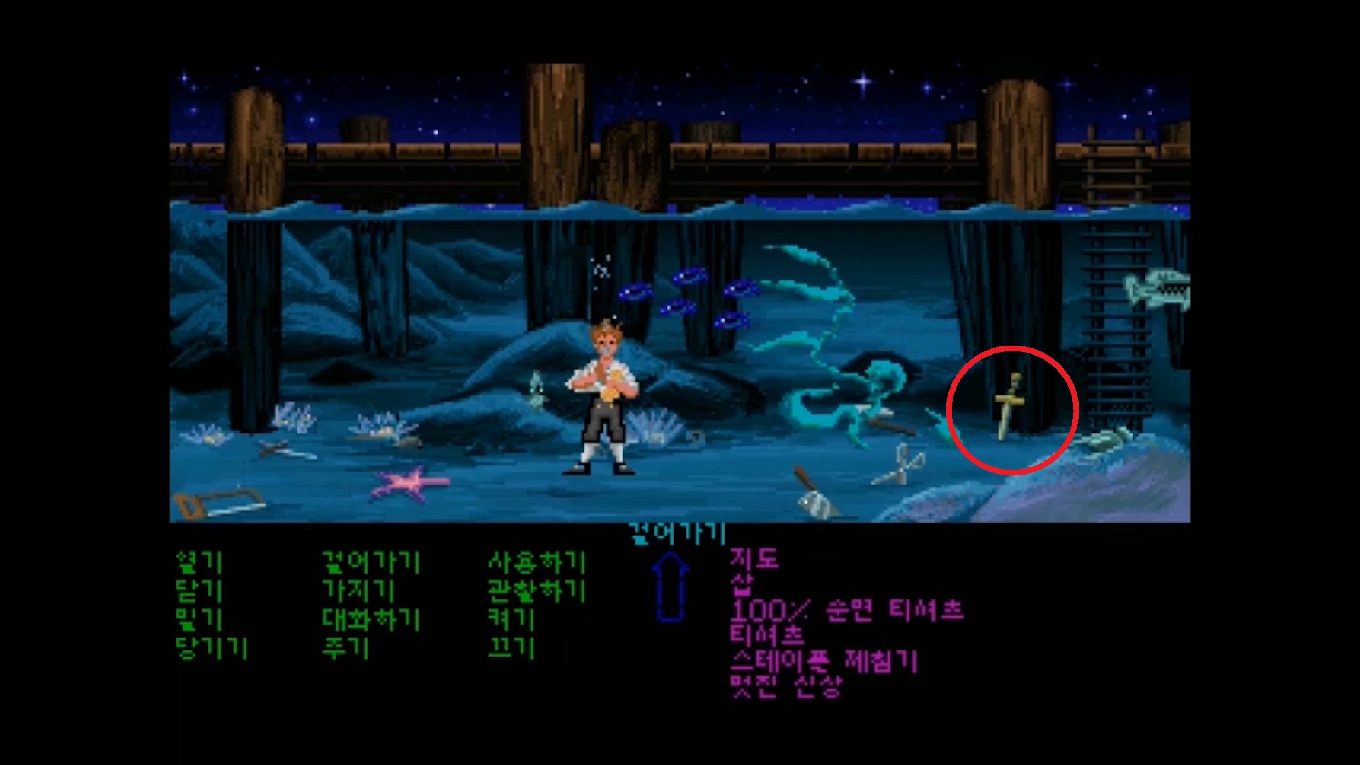 바다에 빠진 채 주변을 살펴보면, 온갖 칼들이 널려 있지만 신상에 묶여 있는 상태이기 때문에 주울 수가 없습니다.