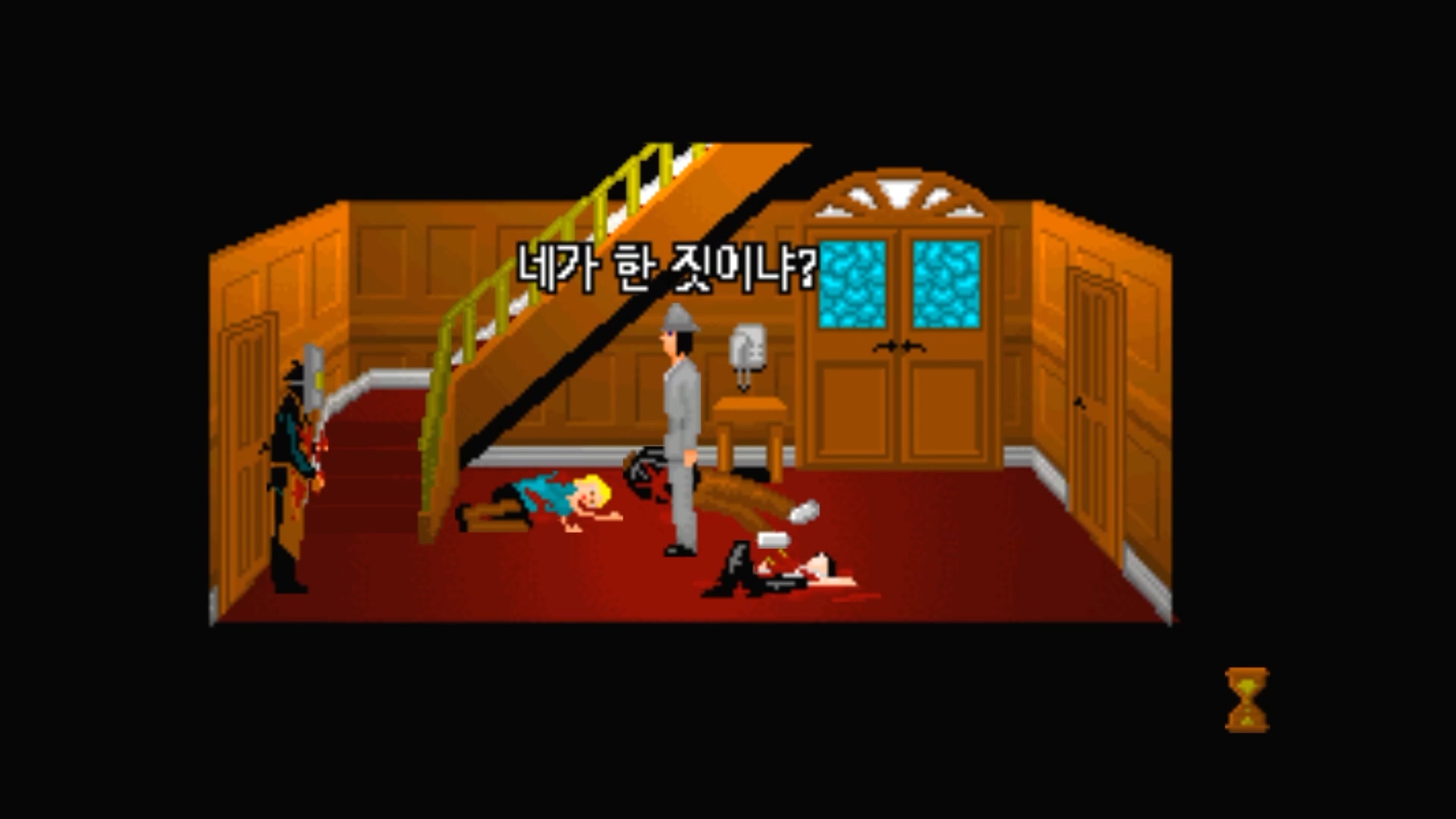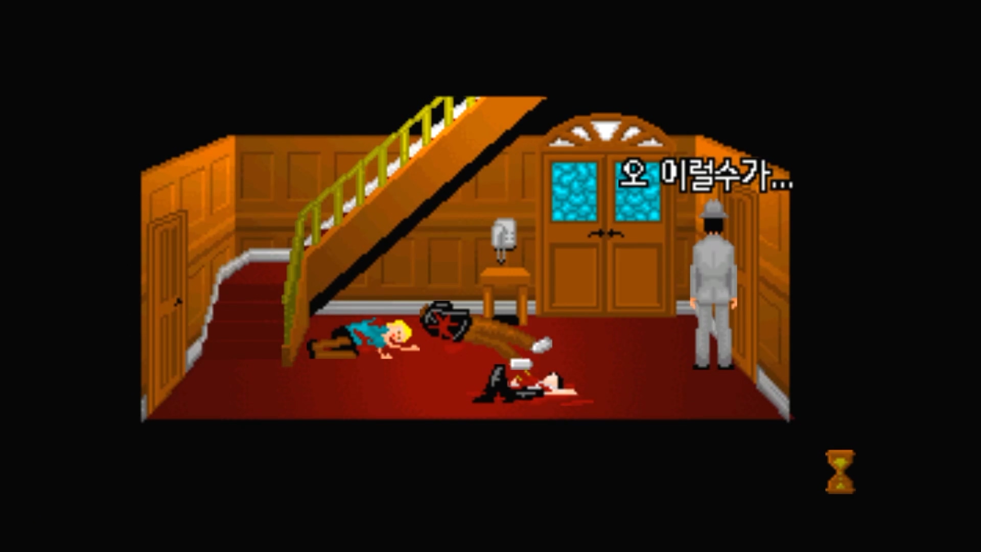 현관문 앞에는 '필'과 '시몬', '짐'이 피를 흘리며 죽어 있습니다.