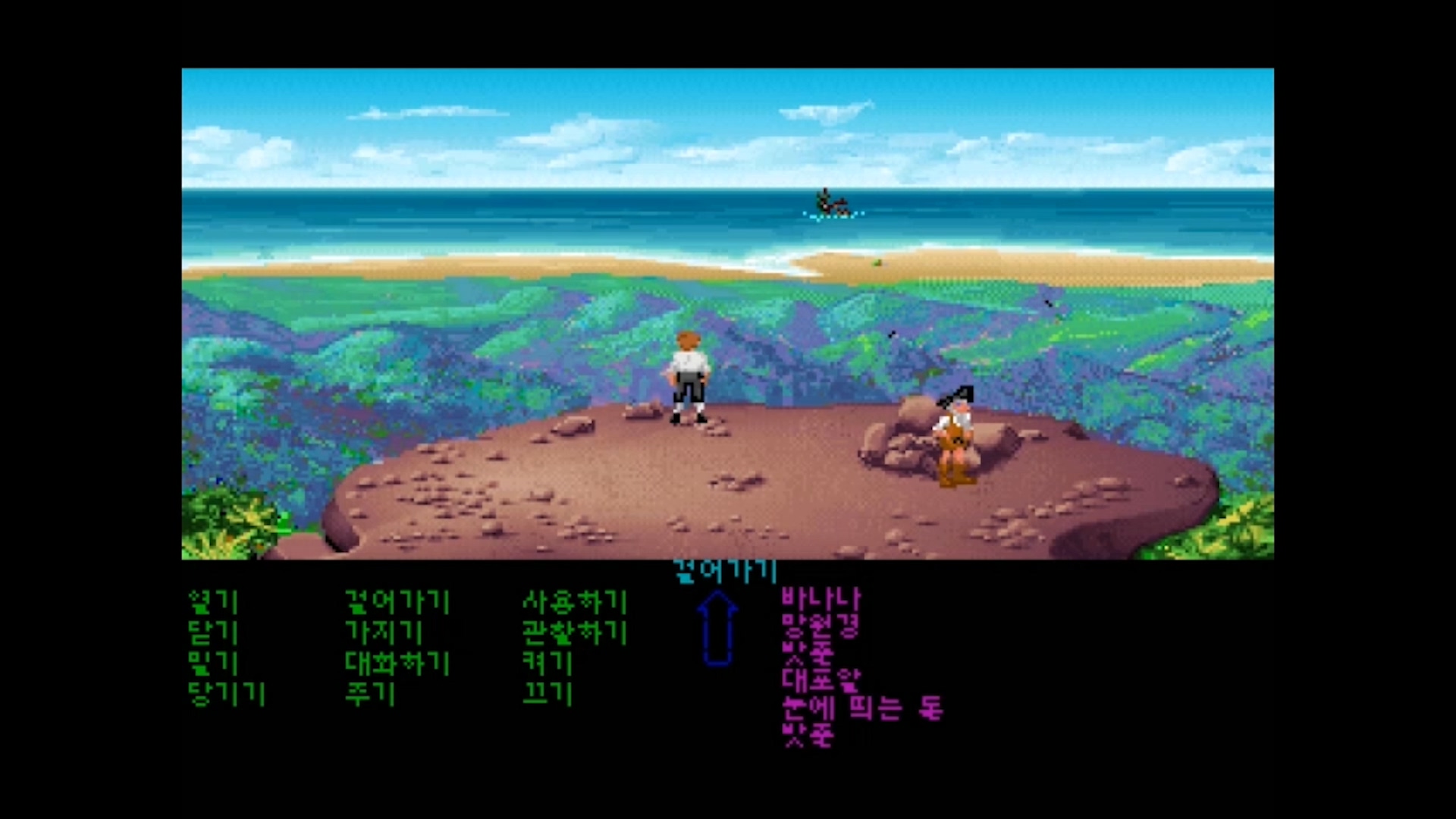 그러면 저 멀리 가이브러쉬가 타고 왔던 '바다 원숭이 호'가 보이는 멋진 풍경이 나옵니다.