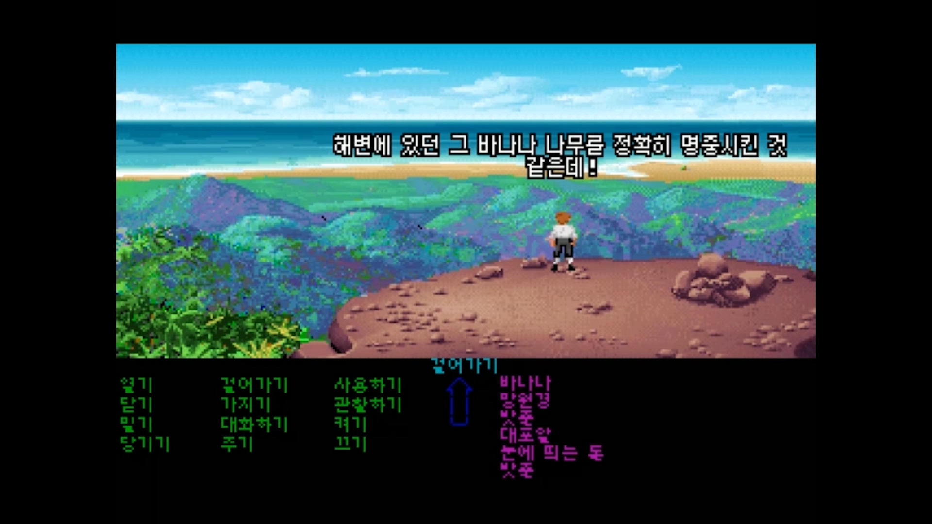 바위가 처음과 다르게 날아가 해변에 있는 바나나 나무를 맞추게 됩니다.