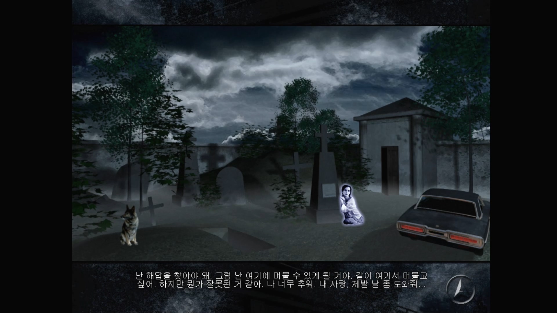 테스의 묘를 확인하고 멍멍이와 대화(?)한 후, 문을 확인해 보면 잠겨 있다는 걸 알 수 있습니다.
